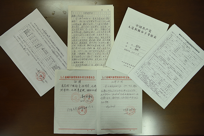 图为郑金西的入党材料和参与换届选举材料。方敏 摄