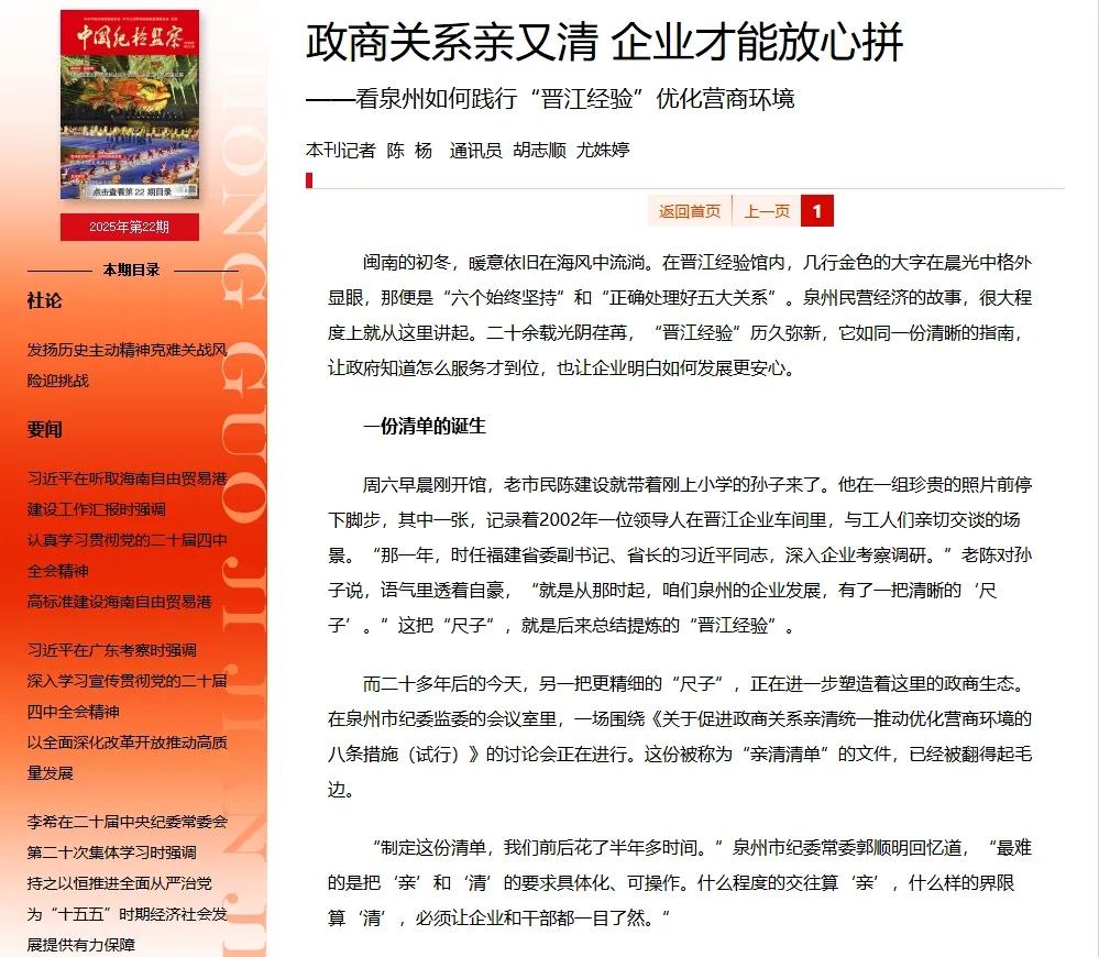 《中国纪检监察》杂志2025年第22期刊发报道泉州践行“晋江经验”优化营商环境的经验做法